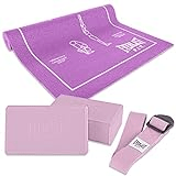 Have all the essentials on hand – all at once! This kit exists in my studio at this very moment. The purple mat is a nice thickness for both home use and for travelling with, and it’s printed with the sun salutation flow. š The yoga blocks and yoga straps that come with the mat make for the perfect beginner yoga accessories.